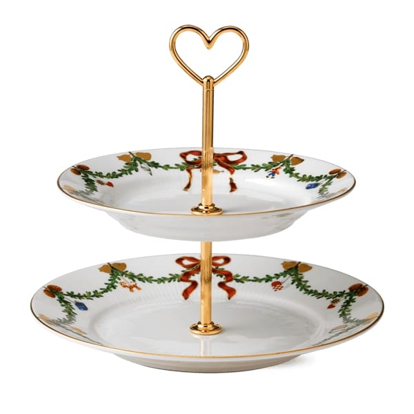 Smuk Étagére med to lag fra Royal Copenhagen Étagéren består af to lag, der hver især er dekoreret med det elskede motiv fra Stjerne Riflet Jul, hvor granguirlander og juleornamenter danner rammen om en klassisk og stemningsfuld opdækning. Étagéren kan